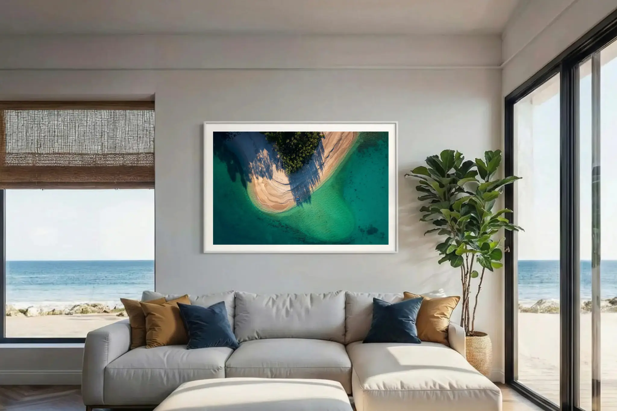 Contrairement aux photos de plage classiques, la vue aérienne supprime le superflu et aplatit les perspectives. Elle transforme le paysage en une composition graphique et simplifiée, agissant dans une pièce comme une fenêtre ouverte sur un paysage immobile et silencieux, propice au calme.
